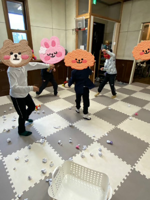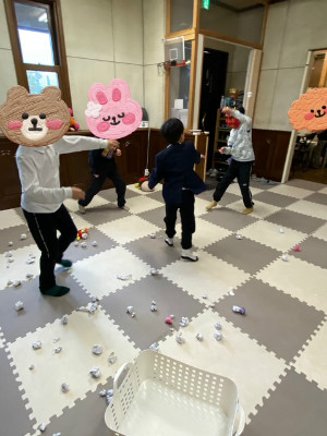 1日遅く節分行事を楽しみました。 鬼のお面を見て少しドキドキする様子もありましたが 「鬼は外!福は内!」の掛け声とともに鬼退治をしました。 今回は安全面を考えて豆の代わりに紙を丸めた物を使って豆まきを 行いました。 子ども達は一生懸命鬼に向って投げ、元気な声が室内に響いていました。 鬼を追い払った後は「やった!」と嬉しそうな子ども達♪ 「次僕、私が鬼役したい」と順番を守って楽しむことが出来ました。 これからも季節の行事を取り入れながら子ども達と楽しく過ごせる 活動を行っていきたいと思います。