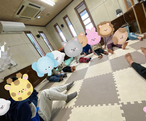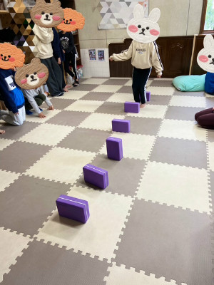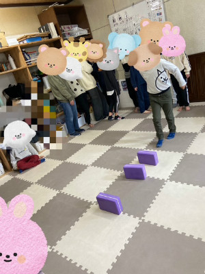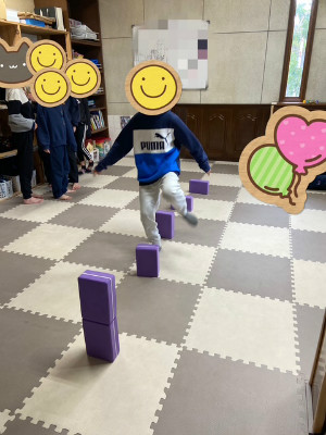 今月も月に1回のヨガ教室を行いました。 講師の先生に教えて頂きながらゆっくりと体を伸ばしたり 呼吸を意識したりして体を動かしました。 バランスをとるポーズや体を伸ばす動きでは先生の見本を見ながら 「できた!」「見て!」と嬉しそうな声も聞こえ 和やかな雰囲気の中で活動することができました。 ブロックを使ったジャンプ運動では 積んだブロックに向いジャンプ! 1段に慣れたら2段、3段…と1段ずつ高くなるブロックを跳べるか挑戦 する姿が見られました。